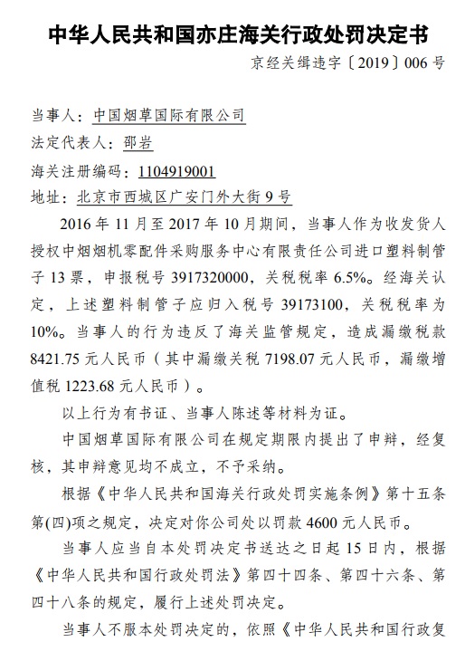 2019年4月10日,北京海关网站发布的亦庄海关行政处罚决定书(京经关缉违字〔2019〕006号)显示,中国烟草国际有限公司涉嫌违反了海关监管规定被行政处罚。