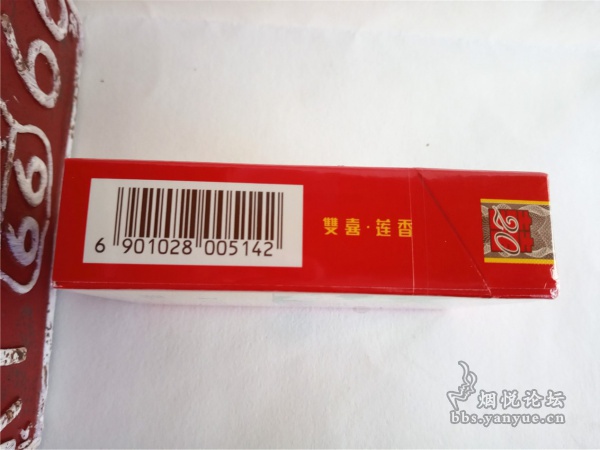 烟盒的四周设计的是大红色为底色,左侧是广东中烟出品的字样和理化指标:焦油量TAR:10mg、烟气烟碱量NICOTINE:1.0mg、烟气一氧化碳量CARBON MONOXIDE:12mg。右侧则是这款烟的条码和双喜莲香的字样等。