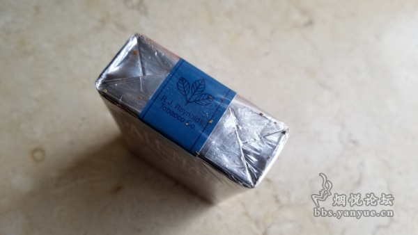 烟盒顶部,是R.J.雷诺兹经典的天蓝色烟封,顶部是其三叶Logo和公司标识。