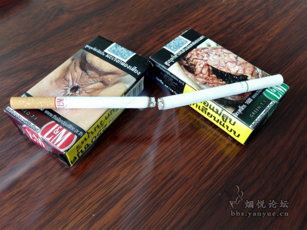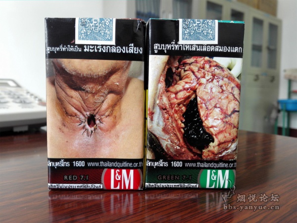 泰式香烟素以恐怖恶心的警示图片闻名于世。而且,警示图片所占烟盒面积的比例非常大。红款烟盒正反两面下方印有RED字样,绿款印有GREEN字样。
