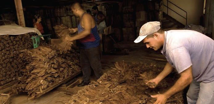 叶子从杆上取下并捆成捆,西班牙语称为gavillas。到这里农民的工作就结束了,接手的是烟草公司烟叶收购和烟叶改良部门。 他们负责从农民那里购买叶子,把叶子放到分拣室进行分拣,然后发酵。