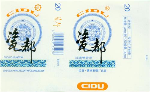 青花瓷,又称为“白地青花瓷”,常简称为“青花”,是中国瓷器的主流品种之一。景德镇素有“瓷都”之称,是元、明、清三代皇家瓷厂所在地,其瓷器以独特风格蜚声海内外。上世纪80年代,江西赣南卷烟厂出品的“瓷都”(图①)烟标,其主版展示了一只景德镇生产的青花双龙戏珠纹瓷盘,这种釉质透明如水,胎体质薄轻巧,洁白的瓷体上辅以蓝色纹饰,素雅清新、充满生机。具有很高艺术价值的青花瓷,已经成为瓷器的代表。