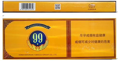 真品卷烟:1.商标稻穗图案凸起,整体立体、饱满,手摸凹凸感强。2.99数字笔画圆润、饱满,下面圆点突起,金属感强。3. 蓝色底纹颜色重,边缘向中间色彩过渡自然。