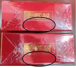 3、卷烟底部钢印:真烟钢印呈现深浅不一,钢印有力的特征。假烟钢印模糊不清晰或呈现钢印印记均匀的特征。(上真下假)