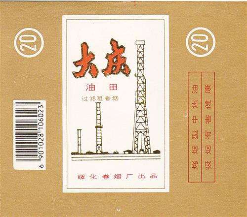 1959年9月26日,在松嫩平原上一个叫大同的小镇附近,从一座名为“松基三井”的油井里喷涌出的黑色油流改写了中国石油工业的历史:松辽盆地发现了世界级的特大砂岩油田!由于当时正值中华人民共和国成立10周年大庆之际,黑龙江省领导提议将“大同”改为“大庆”,将大庆油田作为一份特殊的厚礼献给成立10周年的新中国。从此,“大庆油田”这个取之于国庆的名字叫响全国,传扬世界!上世纪90年代初,绥化卷烟厂出品的“大庆油田”烟标(图④),主版图案展现的就是井架林立的大庆油田。