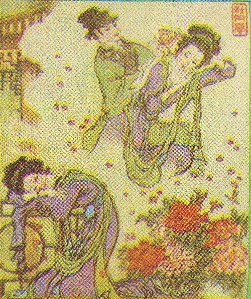 同一时期,昆明火柴厂还以《牡丹亭》为蓝本出品了5枚套“牡丹亭”火花。其中,第一枚为《牡丹亭》作品封面;第二枚为“闺塾”(图⑦),描绘了老学究为闺阁小姐杜丽娘上课的情景;第三枚为“惊梦”(图⑧),展现了杜丽娘的梦境:在牡丹盛开的凉亭下,柳生正将一朵艳丽的牡丹插戴在她的鬓间;第四枚为“写真”,展现的是杜丽娘作自画像的情景;第五枚为“婚走”,描绘的是柳生扶起起死回生的杜丽娘一起回家的一幕,极具浪漫主义色彩。