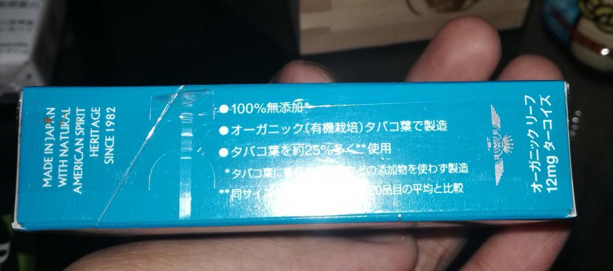 日免的蓝色美国精神。 正面 反面(看来介绍的挺全面) 侧面(100%无添加) 侧面 (焦油量12mg,烟碱量1.5mg。并且再三强调无添加的香烟同样有害健康) (本土版与免税版的区分点就是