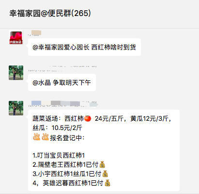 蔬菜、水果、海鲜、鱼、肉,还有什么糕点、大枣、山药、地瓜……总之各种各样的便民群团购群,每天都在招着手和你说,这里很便利,这里很便宜,快点来买呀,买呀!