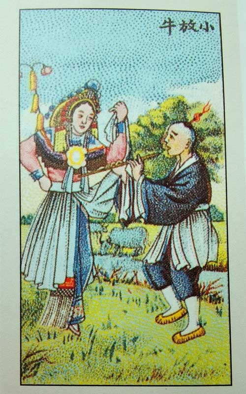 英国烟厂出品的《百戏图》烟画片,顾名思义,全套烟画片有一百枚之多,一百出戏浓缩在小小的烟画片上,应是每出戏的精华所在。其中就有一枚儿童京剧《小放牛》,这套烟画片为小片,无序列号,手绘彩色,色泽艳丽。烟画片的背面印有“三金钱唛”牌和“金鹿”牌烟盒商标图案。《小放牛》剧情非常简单:牧童放牛时遇见问路的小村姑,于是两人一语来、一言往,说说唱唱,活泼有趣。剧中牧童为丑角,小村姑为花旦,他们之间精彩的对话与对唱,深受当时孩童们的喜欢。游戏时,对照《小放牛》烟画片,男孩画瓢牧童,女孩依样村姑,一唱一和,为童年生活添趣不少。这枚烟画片上,牧童稚气未脱,一袭简朴的放牛行头,正在小村姑面前吹着笛子。小村姑则正青春,亭亭玉立,眉清目秀。京剧中丑角大多是稀疏平常的小人物,往往是热心助人、善良正直却不失机智幽默,而花旦大多是天真烂漫、聪明伶俐又不失活泼俏皮。花旦一般不穿带水袖的上衣,下身配裙装或裤子,双手露在外头,一手一定要拿块手帕,以衬托她们的单纯可爱。“三月艳阳天,牧牛到村边,野花红又妍,山草青又鲜……”牧童的唱词景象,展现在了这枚烟画片,令人赏心悦目。