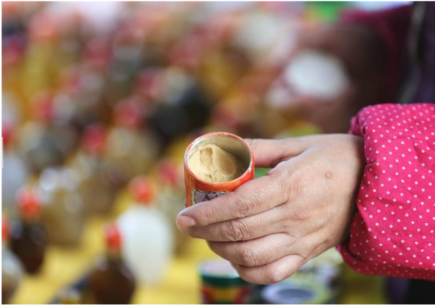 如有客来,从长者开始,年少者依次与客人递换鼻烟壶。年少者需欠身双手递上鼻烟壶,同时接过长者的鼻烟壶,取出少量吸闻后,再双手返还并拿回自己的鼻烟壶。在吸闻鼻烟时,大家互致问候和敬意。图为一盒装有粉末状的鼻烟