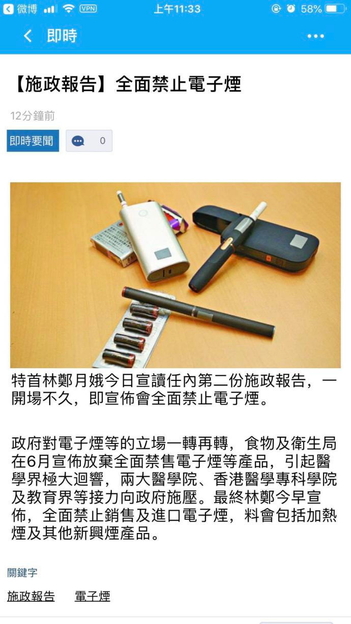 在10月5号,香港多个医学界及病人组织还宣布成立禁电子烟大联盟,要求特区政府尽快禁止电子烟及加热烟等新兴烟草产品。这最终推动了今早这份报告的生成,即全面禁止销售及进口电子烟,包括加热烟及其他新兴烟产品。