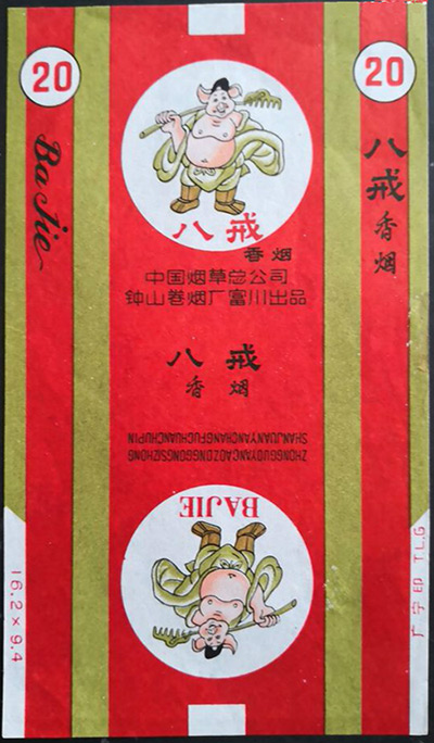 广西钟山富川卷烟厂生产过一款八戒香烟,图案是猪八戒扛着钉耙开怀大笑,其脚下还标有八戒二字(图8)。