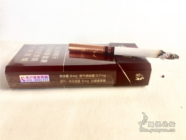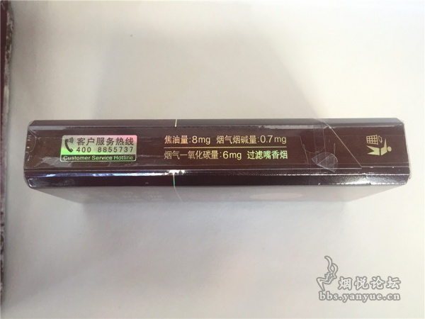 右侧则有客户服务热线和理化指标:焦油量:8mg、烟气烟碱量:0.7mg、烟气一氧化碳量:6mg,过滤嘴香烟,这款细支烟而且各项指标还普遍底。