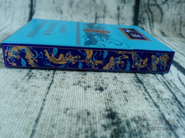 此款中支规格的长天滕王阁,属于宽版烟盒系列。烟盒的宽度是65mm,高度是90mm(烟支的整体长度是88mm,稍长于普通规格的84mm款式)。整体主色调以中蓝色泽为主(因为光线与拍摄手法,图片中的蓝色显得有些淡),上下左右四个侧面饰以深蓝色调的图案。之所以名之长天,取王子安千古名篇《滕王阁序》中的“落霞与孤鹜齐飞,秋水共长天一色”。同理,渔舟唱晚、物华天宝(普软)、长天一色(普硬)、人杰地灵(普细)和紫光等名称,也是出自于此名篇。