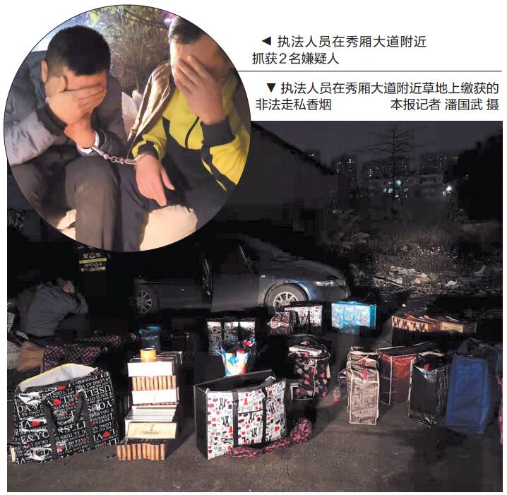 夜幕中,在秀厢大道一偏僻处荒草地,2名男子正在交易走私香烟时,这时候执法人员出现了,将2人逮个正着,警方随后从小车里搜出1229条走私香烟……