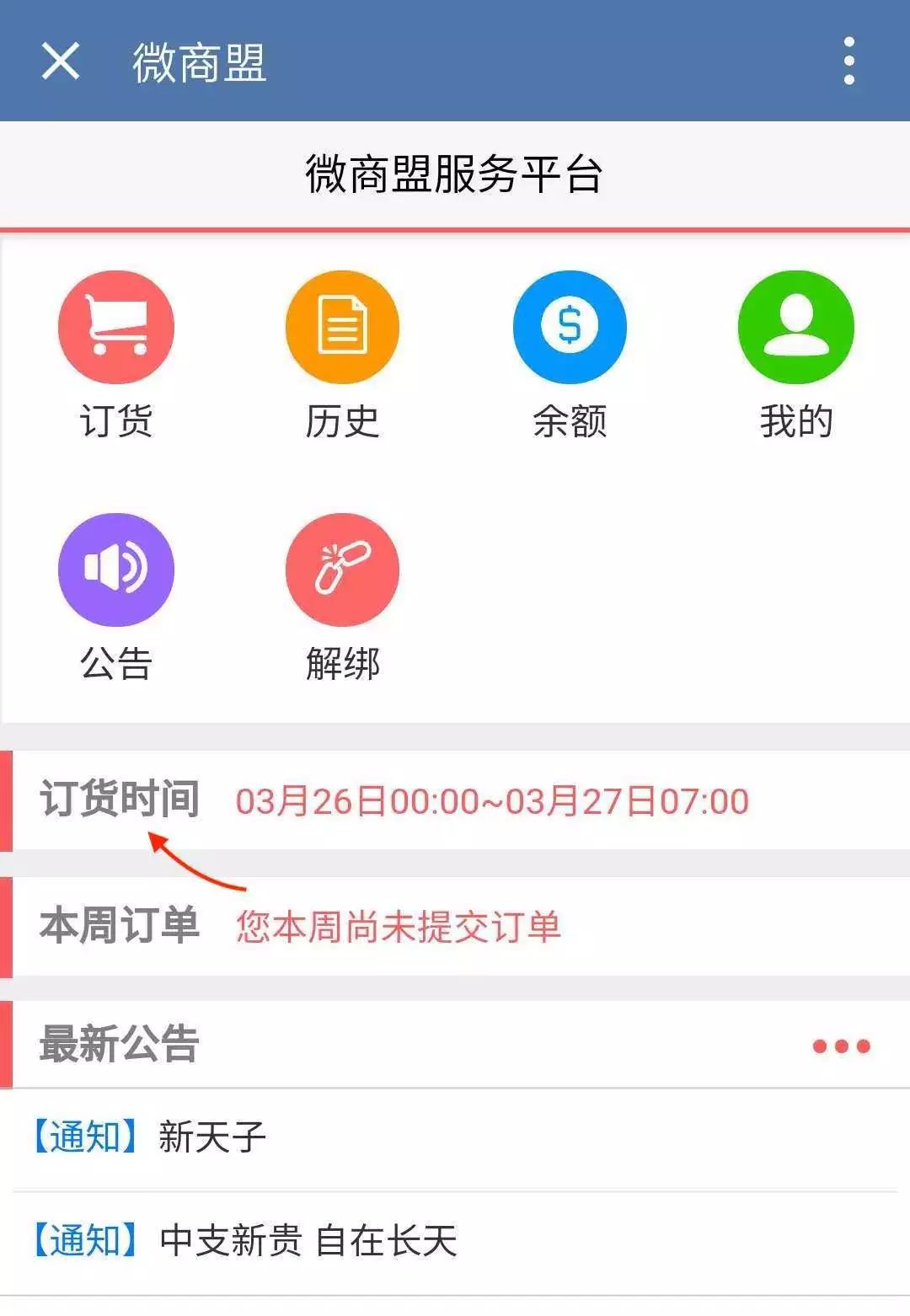 出现这种情况的亲不要着急,联系客户经理恢复订货,在下周订货时就可以看到正确的订货时间了。