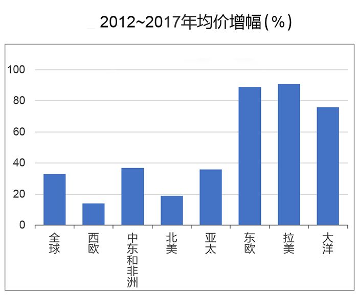 全球卷烟均价不断提高,但近年来价格增长乏力问题日益凸显。大洋洲仍保持均价最高,其次是北美、西欧、拉美。大洋洲、东欧仍是均价提高最快的地区,俄罗斯的增长有所放缓。北美拥有强大购买力及强势卷烟品牌,预计仍有较强的增长动力,但替代品可能产生较大影响。西欧的价格提高尤其缓慢,消费者的价格弹性越来越大,卷烟替代品更为普遍。