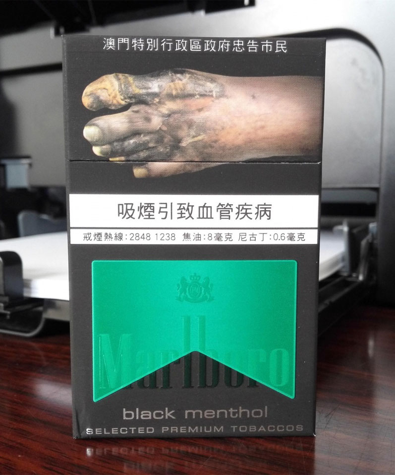 日台澳三款黑绿万的整体包装设计样式,都是相同的。主体色调都是黑色,万的倒三角LOGO是绿色。之所以称为黑绿万,是缘自black menthol字样。此款澳免是警示图片样式。