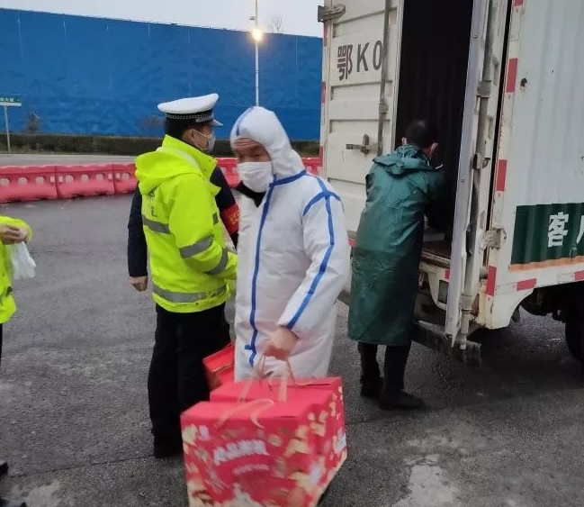 2月14日,卷烟零售业分会捐赠物资管理专班人员将筹集的物资清点登记后,迅速送到市公安局、东马坊镇政府、陈河镇政府、应城二桥卡口值守点、武荆高速卡口值守点等抗疫一线工作人员手中,为战斗在抗疫一线的战士鼓劲加油。